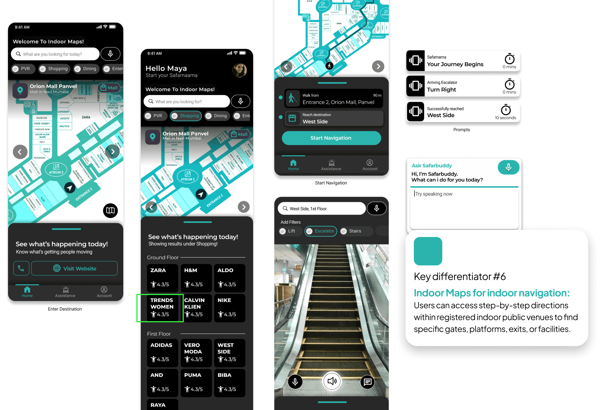 Users can access step-by-step directions within registered indoor public venues to find specific gates, platforms, exits, or facilities.